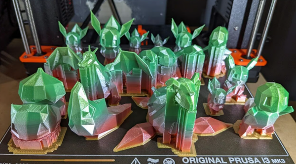 3D模型的大小会显著影响颜色渐变的可见性。较大的模型更可取,因为它们可以让灯丝的颜色过渡更自然地展开。例如,如果灯丝每5到10米改变一次颜色,小模型可能无法利用足够的灯丝来显示完整的渐变,从而导致颜色变化不太明显。具有连续表面的设计(例如花瓶或碗)非常适合突出显示这些过渡。或者,如果您必须3D打印许多模型(如上图所示),同时进行可以帮助您充分利用灯丝的使用,以确保更明显的过渡。