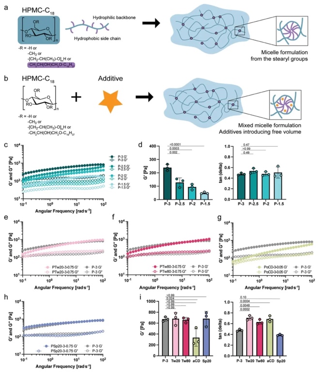 1. HPMC-C18水凝胶配方及添加剂影响研究,通过制备不同HPMC-C18聚合物含量与各类添加剂(吐温、司盘、α-环糊精等)的水凝胶样本,运用频率扫描、稳态剪切应力扫描、振幅扫描等流变测试方法。研究HPMC-C18水凝胶的线性粘弹性、非线性屈服特性以及添加剂对其动态力学性能和流动性能的影响。结果表明,增加聚合物含量可提升水凝胶刚度,但对粘弹性影响较小;吐温、α-环糊精等添加剂能有效调节水凝胶的粘弹性、应力松弛时间和屈服应力,且可实现对水凝胶刚度和粘弹性的独立调控 。