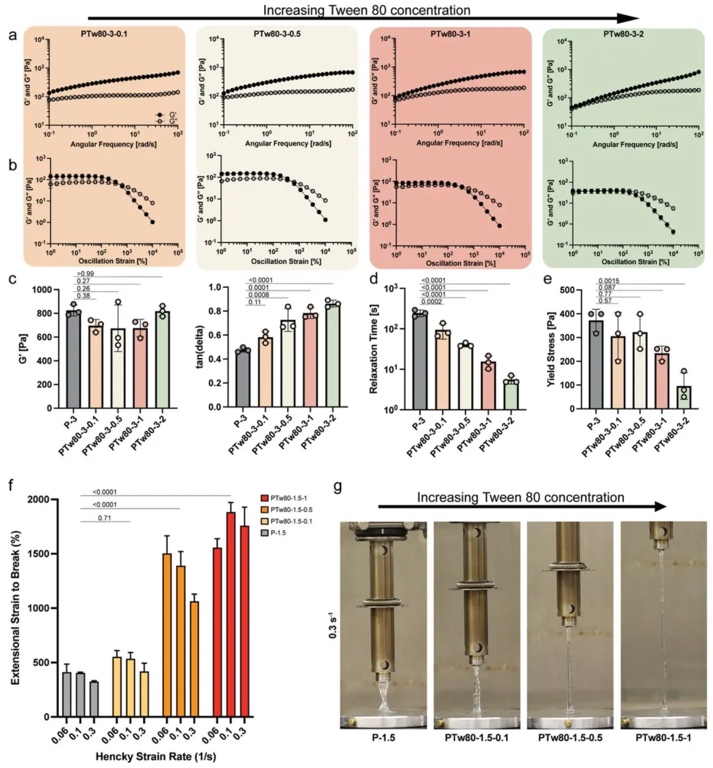 本研究通过将疏水改性的纤维素基聚合物与多种生物材料混合,开发出一种可调节的水凝胶平台。流变学研究表明,添加化学添加剂能够在不改变水凝胶刚度的情况下,调节其粘弹性和应力松弛行为,实现流变特性的选择性控制。丝状拉伸拉伸流变仪测试发现,添加Tw80显著提高了水凝胶的延展性,在Tw80浓度最高的水凝胶中,拉伸断裂应变高达2000%。在3D打印实验中,该水凝胶的高速打印性能显著提升,速度因子提高了5000多倍,有效解决了打印细丝断裂和均匀性丧失的问题。研究结果表明,通过调整水凝胶成分优化其延展性,为高速3D打印带来了新的突破,有助于更高效、精准地制造复杂且功能完备的组织。