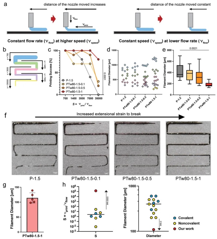 3. PTw80水凝胶3D打印性能探究,利用自制的基于挤出的3D打印机,设置不同的打印速度和材料挤出速度(通过控制流速实现),定义无量纲值S(S等于打印速度除以材料流速)分析打印性,并进行细胞活力和增殖实验。研究PTw80水凝胶在3D打印中的适用性。结果表明,高延展性的PTw80水凝胶打印性能更好,能在更高的S值下保持较高的打印成功率,实现更细的打印丝直径和更精确的打印分辨率。此外,该水凝胶具有良好的细胞相容性,能促进细胞增殖 。