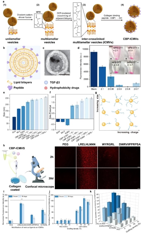 1. CBP-ICMVs的合成及物理表征:通过化学合成、透射电镜(TEM)、动态光散射(DLS)、ζ电位测定等方法,研究CBP-ICMVs的合成过程、结构、粒径、表面电荷以及不同肽修饰对其结合能力的影响。结果表明,成功合成CBP-ICMVs,其粒径随合成步骤逐渐增大,ζ电位变化证实了肽的成功共轭;不同肽修饰的ICMVs对胶原蛋白的结合能力不同,LRELHLNNN修饰的ICMVs结合能力最强,且20%的修饰密度时效果最佳。