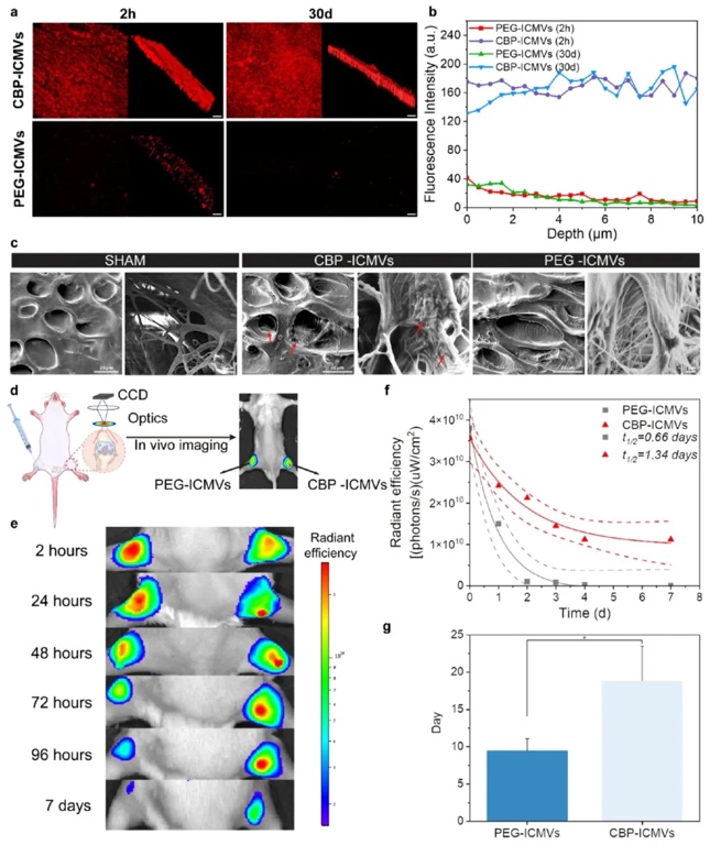 2. CBP-ICMVs在体外和体内延长软骨驻留时间并穿透软骨细胞外基质:运用共聚焦显微镜观察、扫描电镜(SEM)、体内成像系统(IVIS)等技术,以兔软骨切片和小鼠膝关节为研究对象,探究CBP-ICMVs的穿透和滞留能力。结果显示,CBP-ICMVs在体外能快速穿透并长时间滞留在软骨细胞外基质中,其荧光强度在2小时和30天时均显著高于对照的PEG-ICMVs;在体内,CBP-ICMVs在小鼠膝关节中的滞留时间明显长于PEG-ICMVs,关节内半衰期从0.66天延长至1.34天,提高了药物递送效率。