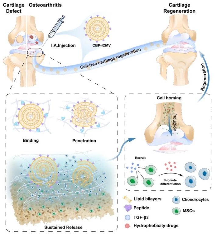 骨关节炎(OA)会致使关节软骨逐渐退化,目前针对OA的早晚期均缺乏有效的治疗手段。软骨再生需要多种药物在损伤部位发挥作用并长时间留存,以招募内源性细胞,促进软骨形成。然而,关节腔内药物清除速度快,且软骨细胞外基质无血管、结构致密,这些因素成为药物输送的主要障碍,导致许多药物半衰期短,难以发挥疗效。同时,现有的纳米颗粒药物递送系统存在靶向性差、难以穿透软骨、载药量低等问题,在治疗早期骨关节炎和全层软骨缺损方面效果不佳。