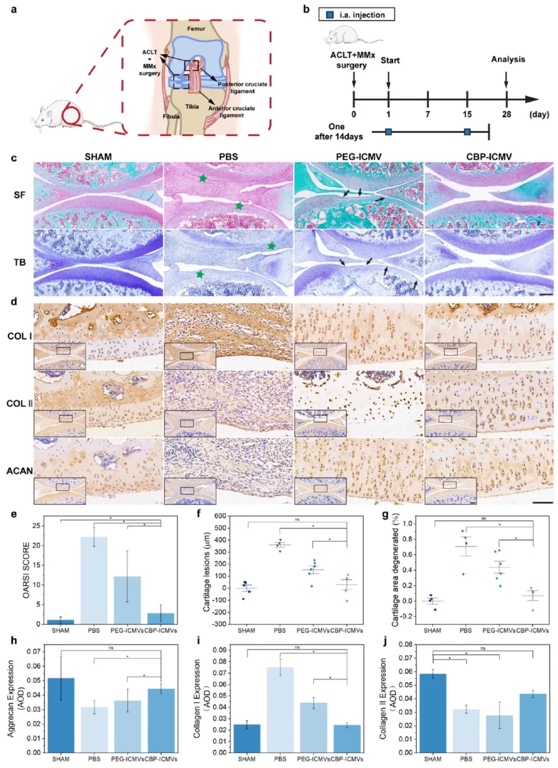 6. CBP-ICMVs负载KGN和TGF-β3减轻大鼠ACLT+DMM模型的软骨退化及治疗OA的能力:建立大鼠ACLT+DMM手术模型,通过组织学染色(HE、番红O、甲苯胺蓝)、免疫组织化学染色(Col I、Col II、Aggrecan)、OARSI评分等方法,研究CBP-ICMVs对早期OA的治疗效果。结果表明,与PEG-ICMVs组相比,CBP-ICMVs组的软骨损伤明显改善,软骨表面更光滑,Col II和Aggrecan的表达增加,OARSI评分更低,有效减轻了软骨退化,促进了OA的治疗。