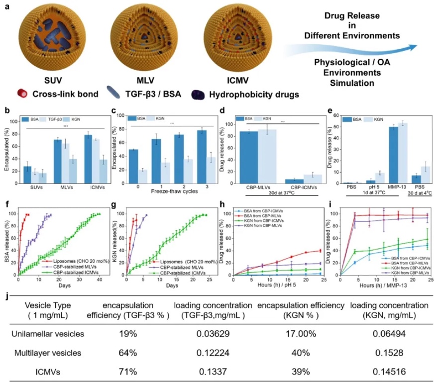 4. ICMVs负载药物的生物活性保留:通过测定不同阶段ICMVs对模型蛋白(BSA、TGF-β3)和疏水性药物(KGN)的包封率、药物释放动力学以及在不同环境下的稳定性,研究ICMVs对负载药物生物活性的保留能力。结果表明,ICMVs的载药量随合成步骤增加,对TGF-β3和KGN的包封率分别约为70%和39%;在37℃的PBS缓冲液中,ICMVs能显著延长药物释放时间,在模拟OA微环境中也表现出良好的稳定性。