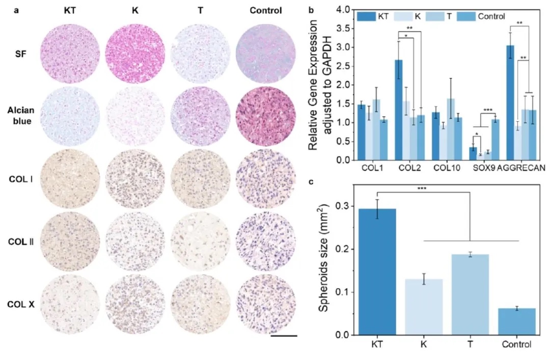 5. CBP-ICMVs负载KGN和TGF-β3促进MSCs体外向透明软骨分化:利用细胞培养、细胞化学染色、免疫细胞化学染色、RT-qPCR等技术,以人脂肪来源的间充质干细胞(hADSCs)为研究对象,探究CBP-ICMVs负载KGN和TGF-β3对MSCs向透明软骨分化的影响。结果显示,CBP-ICMVs负载KGN和TGF-β3的实验组(KT组),在细胞化学染色中产生更多的糖胺聚糖分泌,免疫细胞化学染色中II型胶原蛋白表达最高,RT-qPCR分析表明该组增强了软骨生成相关基因的表达,促进了MSCs向透明软骨分化。