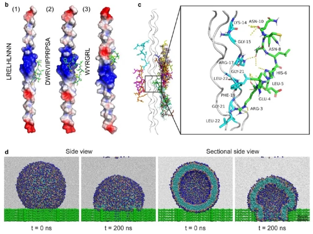 3. 人源II型胶原蛋白与三种选定肽的结合模式评估:采用分子对接和粗粒化分子动力学(MD)模拟的方法,研究三种肽(LRELHLNNN、DWRVIIPPRPSA、WYRGRL)与II型胶原蛋白的结合亲和力和结合模式,以及脂质体穿透软骨细胞外基质的能力。结果表明,LRELHLNNN与II型胶原蛋白的结合亲和力最高,为-7.7kcal/mol;MD模拟证实了脂质体可通过结构变形穿透比自身直径小的网格结构,验证了其穿透软骨细胞外基质的能力。