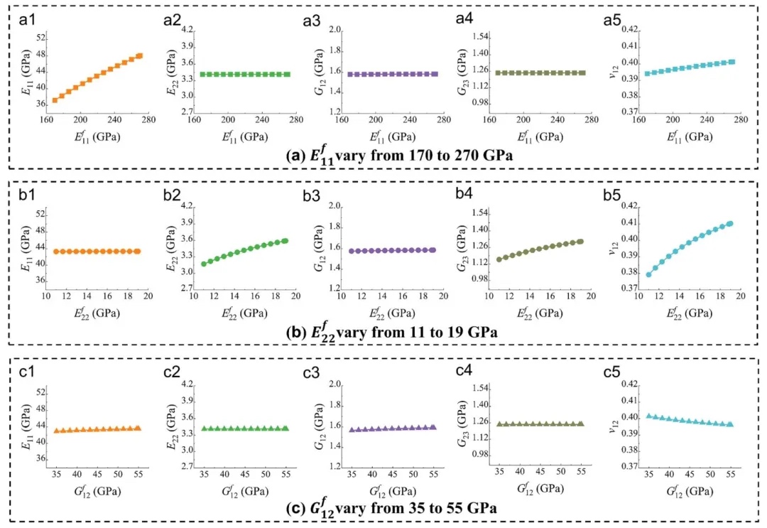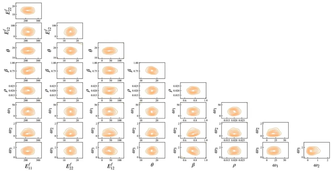 - 敏感性分析:分析材料不确定参数(图14:材料不确定参数对CCFRCs宏观本构参数的敏感性)和微观结构不确定参数(图15:微观结构不确定参数对CCFRCs宏观本构参数的敏感性)对3D打印CCFRCs宏观弹性常数的影响。发现E11^f与轴向模量E11显著正相关,纤维偏移角θ对轴向模量E11影响显著,浸渍百分比β增加可增强复合材料力学性能,束间孔隙率ρ对除ν12外的力学性能有负面影响。此外,通过MCMC方法对模型参数采样,研究组成材料、微观结构和噪声相关不确定参数之间的相关性(图A1:模型参数的联合后验概率密度分布),结果显示这些不确定性相互独立,无明显强相关性,表明选取的输入参数合理。
