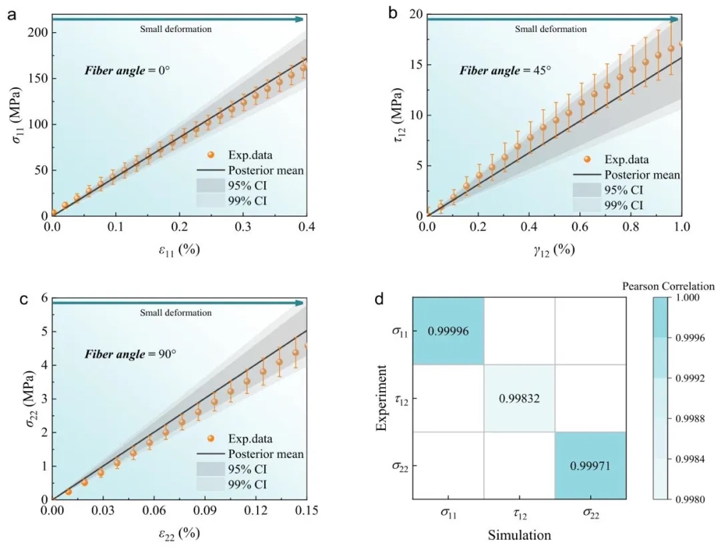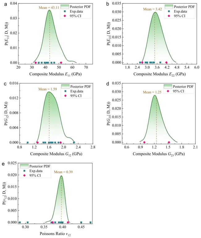 - 宏观性能预测:利用不确定参数后验分布,通过MCMC方法计算后验预测,得到3D打印CCFRCs的宏观力学响应(图12:后验预测与实验结果的应力 - 应变曲线及相关性图)。预测值与实验数据高度吻合,证明多尺度贝叶斯推理的有效性。同时计算复合材料五个独立弹性常数(E11、E22、G12、G23、ν12)的预测分布(图13:复合材料五个独立弹性常数的预测值),预测值与实验数据有较好一致性,但部分测量值存在超出置信区间的情况。