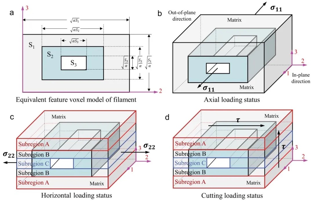 - 多尺度细观力学模型:基于平均场均匀化(MFH)方法,构建多尺度细观力学模型(图6:考虑多种不确定性的多尺度细观力学模型)。微观尺度通过2D FFT和Chamis模型考虑纤维偏移角(图7:CCFRCs中实际纤维偏移、均匀化模型及应力状态示意图);中观尺度通过建立等效特征体素模型(FVE),考虑浸渍百分比对力学性能的影响(图8:打印长丝的等效特征体素模型及加载状态示意图);宏观尺度采用孔隙模型(图9:3D打印CCFRCs的宏观束间孔隙模型),结合中观结果计算宏观力学性能。