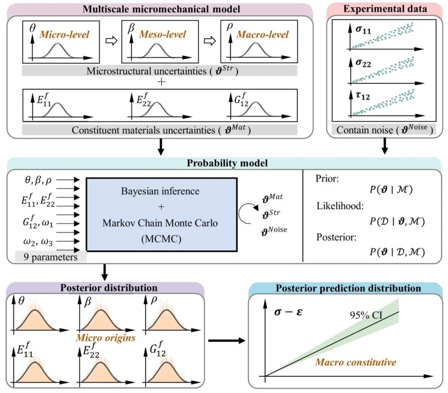 - 概率模型:结合多尺度细观力学模型与实验数据,构建概率模型(图10:多尺度贝叶斯推理流程图)。确定似然函数和先验函数,使用自适应Metropolis算法结合马尔可夫链蒙特卡罗方法(MCMC)计算模型参数(微观结构、组成材料、噪声相关参数)的后验概率分布。