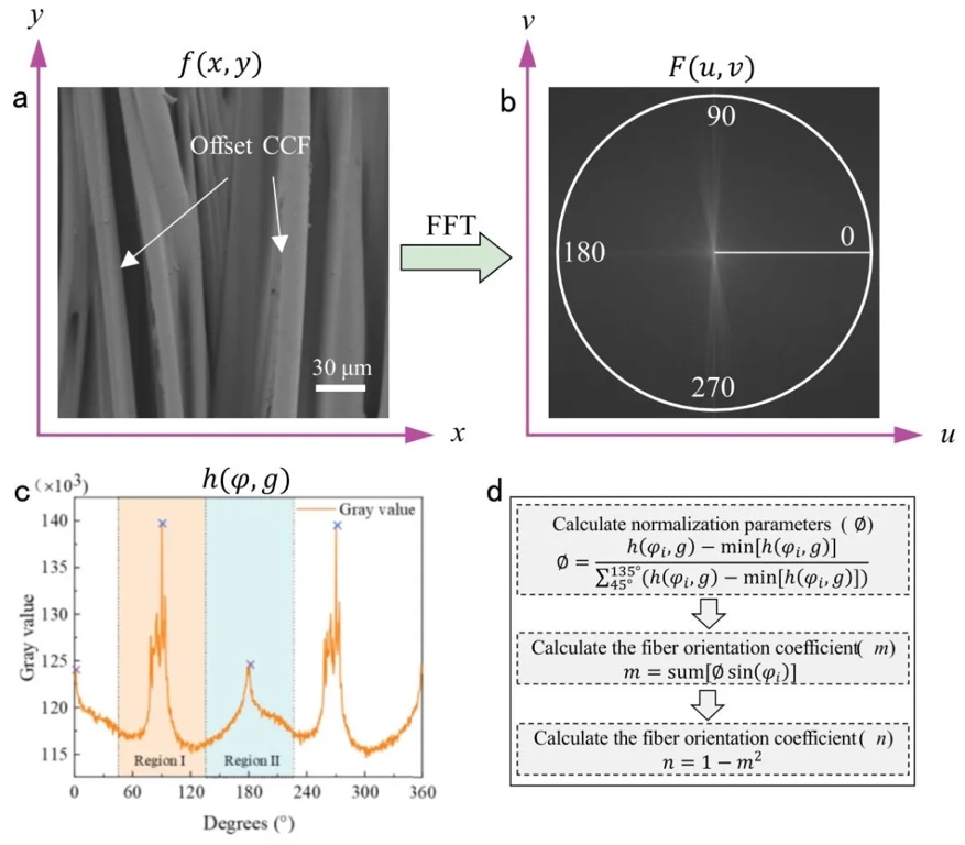 - 微观结构参数表征:利用二维快速傅里叶变换(2D FFT)和扫描电子显微镜(SEM)技术(图4:纤维取向分析),对纤维偏移角进行量化,得到不同样本的纤维偏移角度。通过SEM和图像识别技术(图5:参数校准),对0°试样切片观察,计算浸渍百分比和束间孔隙率等参数,发现不同样本这些参数存在差异。