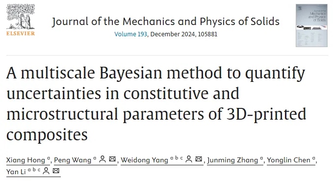 为解决这些问题,同济大学航空航天与力学学院李岩教授团队通过连续纤维3D打印制备复合材料,并利用快速傅里叶变换和图像识别技术校准CCFRCs的微观结构参数。在此基础上,团队开发了一种多尺度贝叶斯方法,构建多尺度细观力学模型揭示材料性能、微观结构参数与宏观本构参数间的关系,并通过概率模型量化这些参数的不确定性。相关工作以“A multiscale Bayesian method to quantify uncertainties in constitutive and microstructural parameters of 3D-printed composites”为题发表在《Journal of the Mechanics and Physics of Solids》上,为优化3D打印CCFRCs的性能提供了有效途径。 同济大学2023级博士生洪翔为论文第一作者,李岩教授、王鹏副教授和杨伟东研究员为论文共同通讯作者。章中森副教授,陈永霖助理教授和张峻铭博士对论文作出了重要贡献。