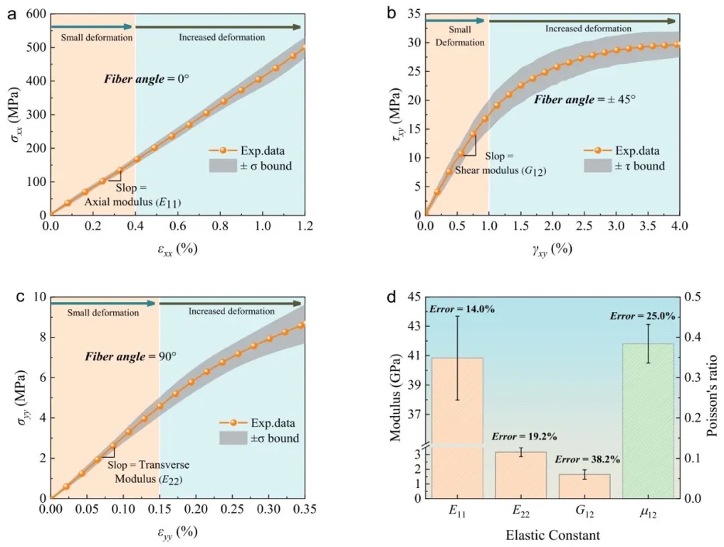 - 力学性能测试:对不同纤维取向(0°、90°、±45°)的试样进行拉伸试验(图2:拉伸试验),获取应力 - 应变曲线(图3:CCFRCs在不同角度下的拉伸应力 - 应变曲线及弹性常数结果)。结果表明,0°CCFRCs应力 - 应变关系更稳定,刚度不确定性约14.0%;45°CCFRCs样本刚度变异性更高,不确定性达38.2%,不同纤维取向试样的弹性常数存在明显差异。