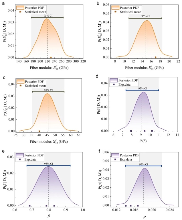 - 贝叶斯校准:得到组成材料不确定参数(E11^f、E22^f、G12^f )和微观结构参数(θ、β、ρ)的后验概率密度分布(图11:组成材料不确定参数和微观结构参数的后验概率密度分布)。结果显示后验分布近似高斯分布,实验值大多在95%置信区间内,材料参数后验均值因纤维损伤低于实验值,微观结构参数实验值与后验区间分布存在差异。