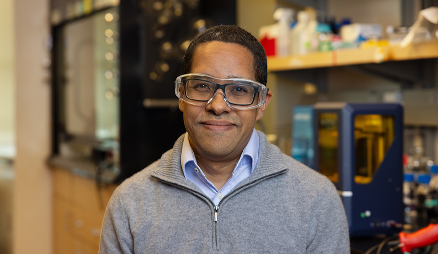 化学教授阿尔沙基姆·尼尔森(Alshakim Nelson)开发了可持续的3D打印材料,有望应用于医学和工程等领域。摄影:胡安·罗德里格斯(Juan Rodriguez)。