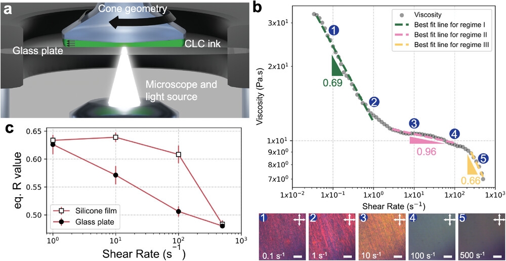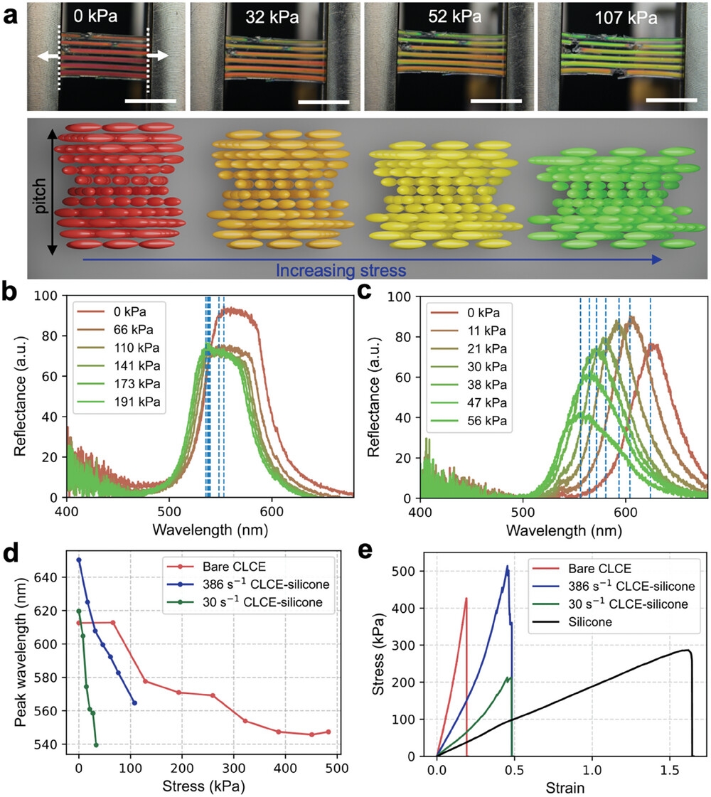 CLCE是一种柔性橡胶状材料,具备独特的光控能力,能够在受到机械应力时产生结构色变化。这一性质源于材料内部有序的扭曲螺旋结构,类似于某些昆虫外壳对光线的反射机制。