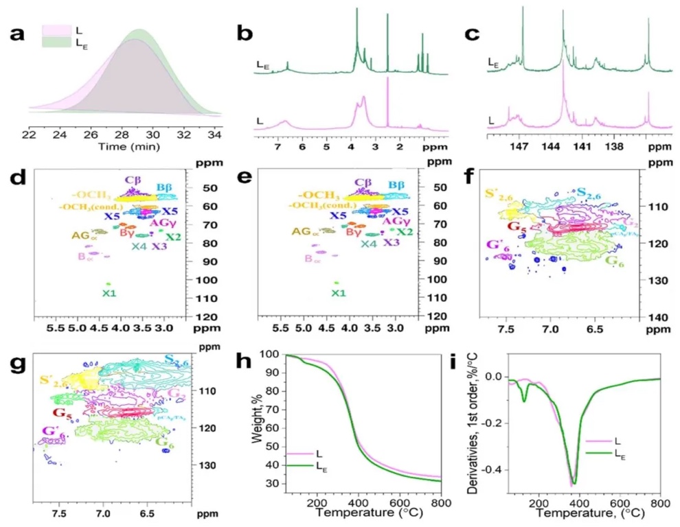 通过凝胶渗透色谱、核磁共振、热重分析等研究方法,研究了未分级桦木碱木质素(L)和乙醇分级后木质素(LE)的化学结构、分子质量和热性能。结果表明,乙醇分级使LE的分子量和多分散性显著低于L,LE的酚羟基含量增加,分子间氢键作用增强,热稳定性有所变化,其起始分解温度和50%失重温度低于L,但最大失重速率温度比L高20°C。同时,LE的玻璃化转变温度低于L ,这归因于其分子量降低、分布变窄和羟基变化。