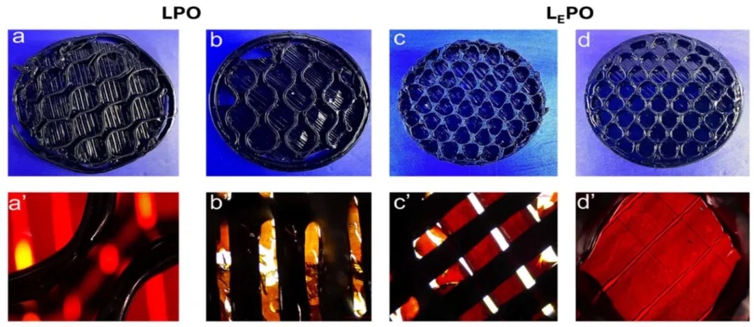 通过温度扫描和频率扫描实验等研究方法,探究LPO和LEPO的流变性能、机械性能和表面性能。结果显示,LPO的复数粘度、储能模量和损耗模量高于LEPO,且LPO的G'和G''交叉点温度比LEPO高15°C,表明LEPO在打印时层间附着力更好,粘性和弹性性能更平衡。频率扫描分析表明两者在打印喷嘴中均能流动,但LPO较高粘度可能导致挤出时细丝屈曲。LEPO的拉伸强度为0.9±0.02MPa,水接触角为92°,高于LPO,疏水性更强。