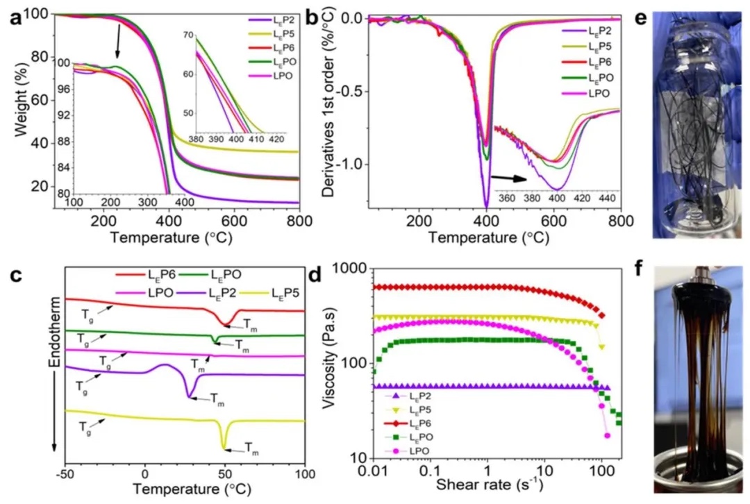 利用热重分析仪和差示扫描量热仪等研究手段,分析木质素 - 己内酯聚合物的热性能和流变性能。结果表明,聚合后的聚合物热稳定性提升,LEPO和LPO的起始分解温度、50%失重温度等高于LE和L。所有样品的玻璃化转变温度低于L和LE。在流变性能方面,LEPO在低剪切速率下粘度更低,LEP2粘度恒定无剪切变稀特性,LEP5和LEP6虽有剪切变稀行为但粘度较高,不适合3D打印,LEPO和LPO因低粘度和良好剪切变稀行为更适合3D打印。