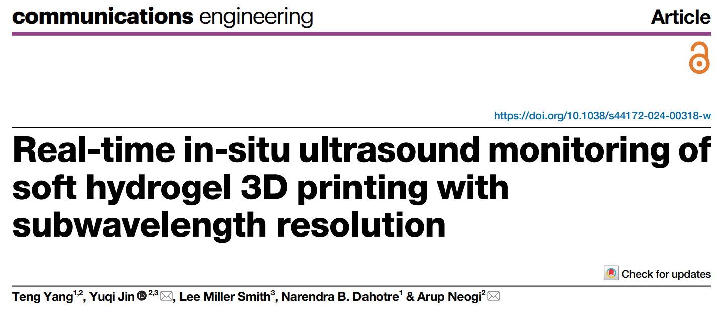 2025年5月23日,北德克萨斯大学的研究人员开发了一种实时原位超声监测系统,能够以亚波长分辨率追踪软水凝胶3D打印中的交联过程。这项研究以题为“Real-time in-situ ultrasoundmonitoring of soft hydrogel 3D printing with subwavelength resolution”的论文发表在《通信工程》杂志上,为观察明胶-海藻酸盐水凝胶增材制造过程中的关键瞬态现象(包括层间粘结、表面变形和重力扩散)提供了新方法。