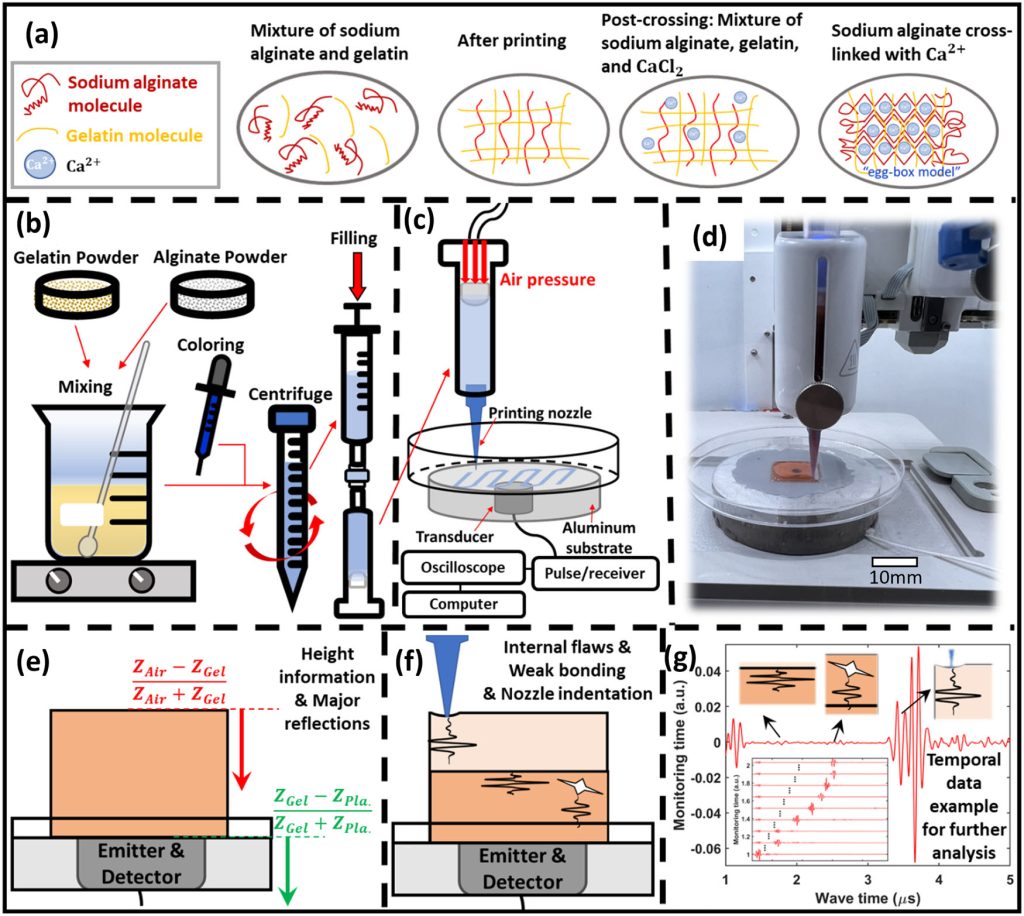 虽然光学相干断层扫描 (OCT) 和 X 射线成像等光学技术已被用于增材制造 (AM) 监测,但它们往往受到材料不透明度或电磁干扰的限制。相比之下,超声波穿透深度更大,并且与高含水量水凝胶兼容。团队的装置采用单站配置,将换能器嵌入定制铝基板中,以实时跟踪每个打印层的反射波形。
