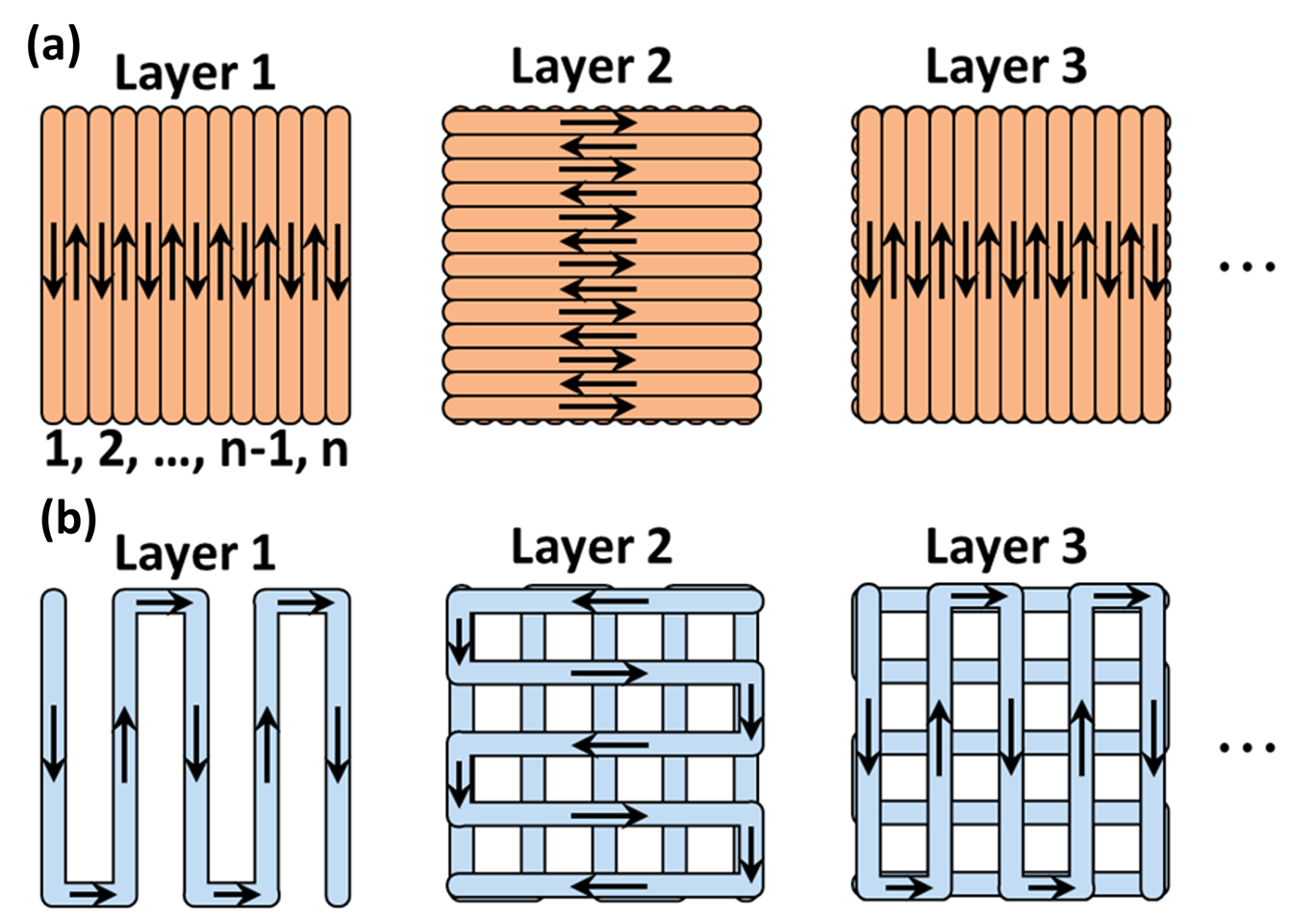 △打印路径配置:a完全填充样品的打印图案。b网格样品的打印图案。