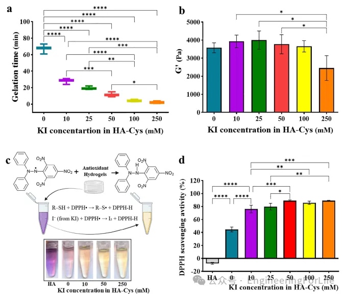 为探究KI催化巯基氧化的作用机制,本文通过流变仪时间扫描测试分析了不同KI浓度下的凝胶动力学。以储能模量(G′)和损耗模量(G″)的交点作为凝胶点,标志材料从流体行为转变为弹性凝胶行为。如图2a所示,KI浓度显著影响凝胶动力学:添加50 mM KI使HA-Cys溶液的凝胶时间从67.3分钟缩短至11.7分钟;当KI浓度升至250 mM时,凝胶速度过快(<1分钟)而无法通过流变测试捕捉(不同KI浓度下的G′/G″交点参见图S2-S7)。这些数据明确证实:KI能在室温及生理pH下氧化HA-Cys的游离巯基,且二硫键形成速率与KI浓度呈正相关。