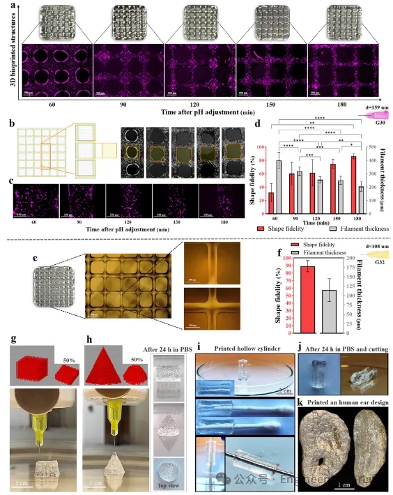 打印精度评估显示(图6b):60分钟时因黏度过低导致纤维流动和边缘圆钝,形状保真度不足设计的50%;随着时间延长,150分钟和180分钟打印的结构精度显著提升(保真度分别达74±7%和86±4%),孔径增大表明形状保持能力增强。高倍荧光图像(图6c)揭示纤维尺寸随时间递减——60分钟时约400 µm,180分钟时降至200 µm(图6d),这种与凝胶黏度正相关的特性确保了打印后结构的均一性和细胞均匀分布。
