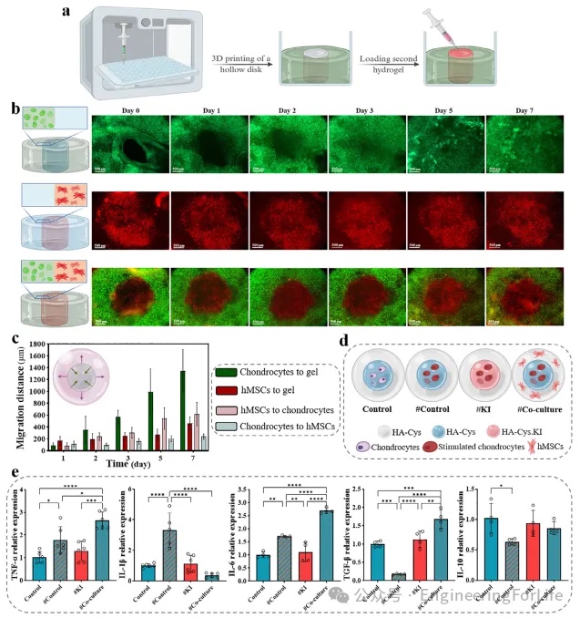 尽管生物墨水中hMSCs与软骨细胞的密度相同,但构建模型所需的空心圆柱与中心腔体积存在差异。通过DiL(红色)和DiO(绿色)荧光染料分别标记hMSCs与软骨细胞,我们追踪了7天培养期内细胞的实时迁移(图8b)。结果显示:模型1中,软骨细胞在第2天开始向中心迁移,第3天即填满无细胞区域;模型2的hMSCs迁移延迟至第7天;模型3则呈现hMSCs在第5天向软骨细胞的单向迁移,而软骨细胞向hMSCs的迁移受限。ImageJ量化分析进一步证实(图8c),hMSCs的存在会抑制软骨细胞迁移,但hMSCs自身受软骨细胞趋化因子驱动定向迁移——这与骨关节炎患者关节滑膜中移植hMSCs向软骨细胞迁移以促进组织修复的临床现象高度吻合。