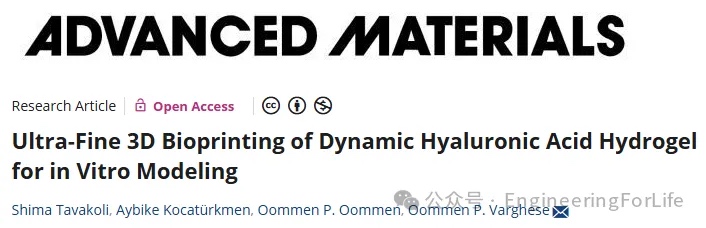 来自瑞典乌普萨拉大学的Oommen P. Varghese团队通过在半胱氨酸修饰的HA中引入动态二硫键交联机制,设计出能在生理pH条件下成胶的HA基生物墨水。针对二硫键交联水凝胶固化速度慢的固有缺陷,创新性添加碘化钾(KI)实现浓度依赖型凝胶加速——KI在维持水凝胶结构完整性的同时,不仅显著提升固化效率,还赋予材料自由基清除能力。当KI浓度控制在50 mM时,墨水可获得超过3小时的打印窗口期,既能保障细胞存活率,又可支持超细针头(32G,内径108微米)打印作业,从而成功构建出尺寸超过3厘米的复杂3D结构。应用该墨水构建的骨关节炎疾病模型,首次揭示了人间充质基质细胞(hMSCs)对炎症环境下软骨细胞的免疫调节作用。这项研究攻克了3D生物打印中的关键技术瓶颈,为创新体外模型构建提供了可靠平台,对疾病建模和精准医学发展具有重要推动作用。相关工作以题为“Ultra-Fine 3D Bioprinting of Dynamic Hyaluronic Acid Hydrogel for in Vitro Modeling”的文章发表在2025年05月13日的期刊《Advanced Materials》。