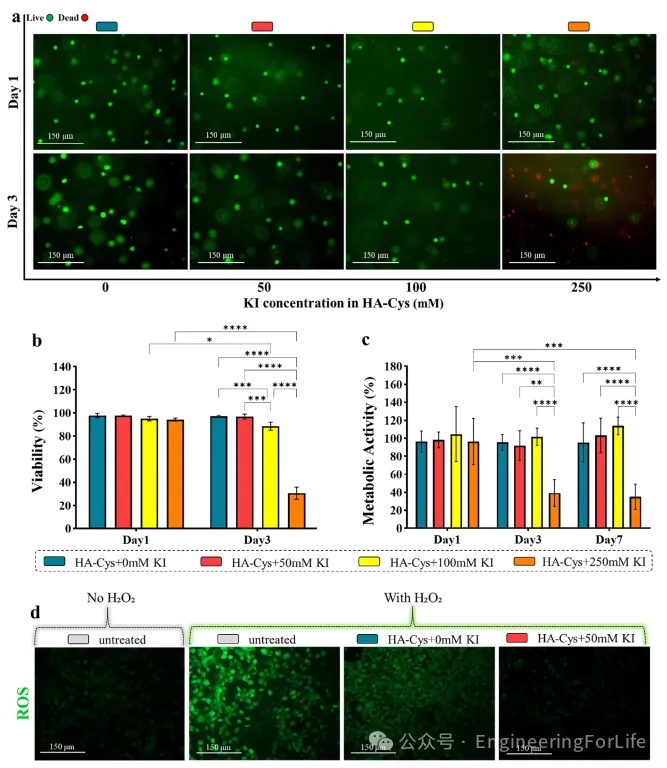 为验证上述结果,本文采用Presto Blue检测评估细胞代谢活性。封装1天后各组无显著差异(图3c),但在250 mM KI高浓度下,3天和7天后的代谢活性分别显著降至39±15%和35±14%。值得注意的是,50和100 mM KI组在这些时间点未出现明显代谢活性变化。为进一步精确评估低于250 mM KI的细胞毒性,我们检测了封装4天后培养基中乳酸脱氢酶(LDH)的释放量(细胞损伤标志物)。如预期所示,250 mM KI水凝胶毒性最高,而50 mM KI组的LDH释放量最低(20.4%),甚至优于100 mM KI组(33.8%)。综合其低细胞毒性、优异自由基清除能力和显著加速凝胶形成的特性,本文最终选择含50 mM KI的HA-Cys(HA-Cys.KI)作为最优配方进行后续分析。