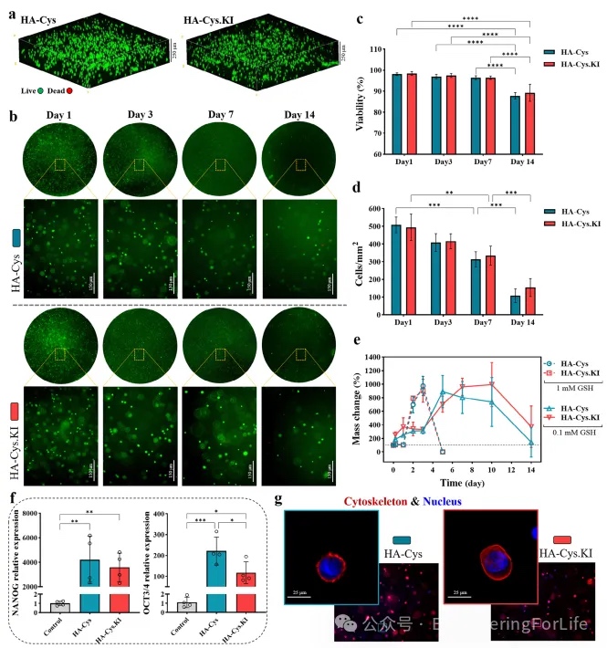 水凝胶基质封装细胞会显著改变其力学性能和降解动力学,这种变化源于细胞分泌的金属蛋白酶和培养基中可溶性因子对生物聚合物稳定性、交联结构及粘弹性的影响。为评估KI对hMSCs相容性的作用,本文进行了活/死细胞染色。图5a的共聚焦3D图像显示,两种水凝胶中的细胞均呈现均匀分布且具有良好生物相容性。