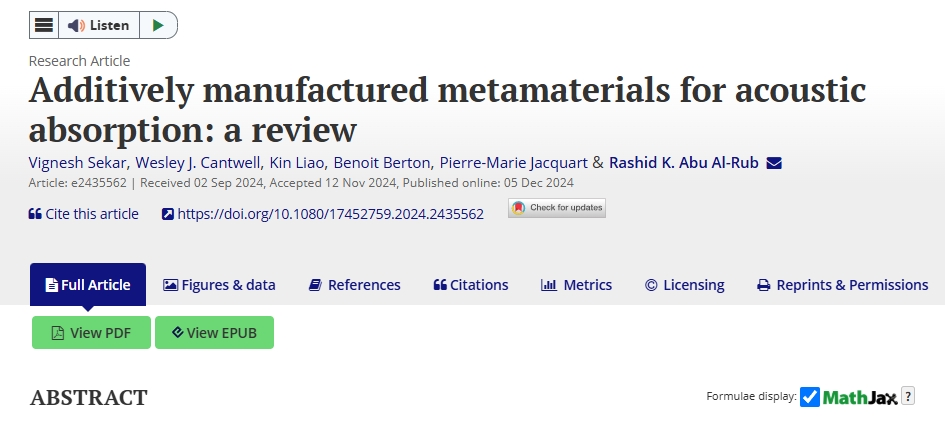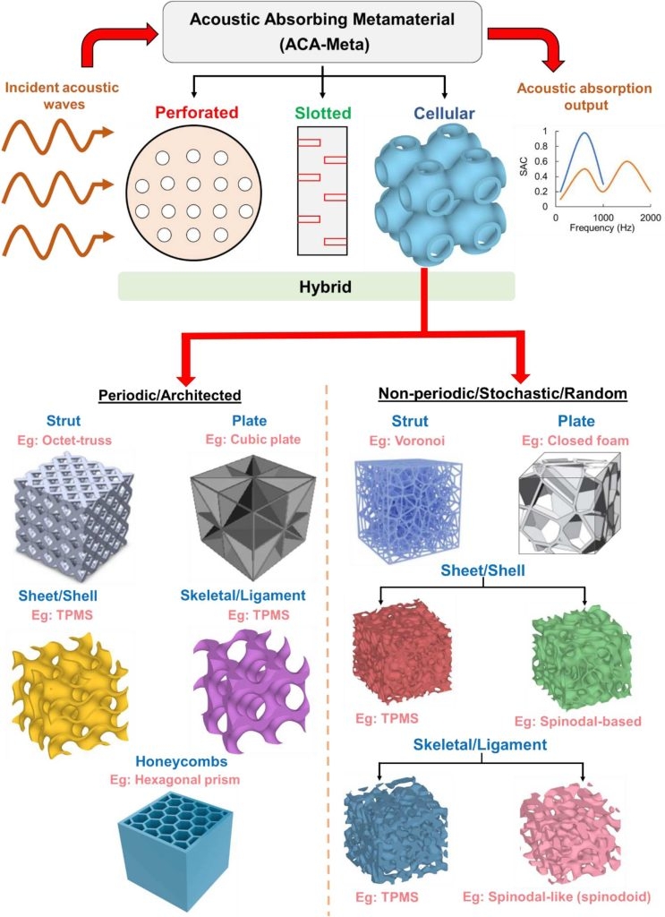 2025年5月26日,哈利法大学与达索航空公司研究团队在国际期刊《虚拟与物理原型》上发表了一篇综述论文。论文系统地探讨了增材制造技术在声学超材料(ACA-Meta)领域的前沿应用。该综述将声学超材料分为四大类:穿孔型、开槽型、蜂窝型及混合型结构,并重点分析了增材制造技术如何在设计自由度和结构性能方面展现独特优势。