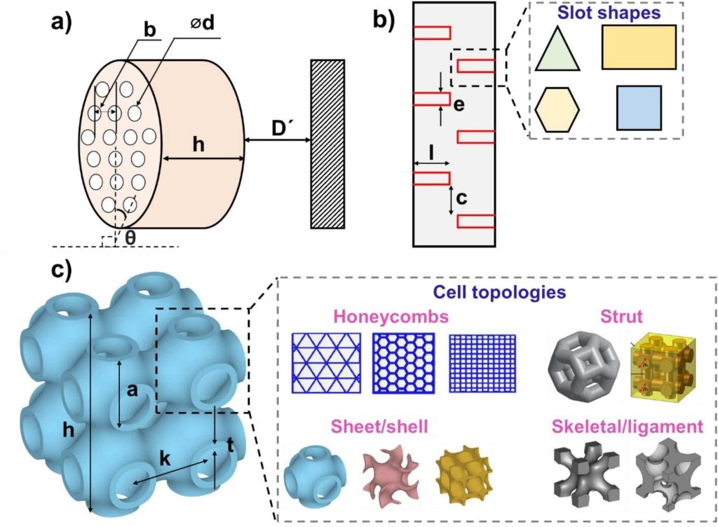 该综述详细介绍了立体光刻(SLA)、选择性激光熔化(SLM)、熔融沉积成型(FDM)和数字光处理(DLP)等多种技术在制造新一代吸声器方面的应用。这些工艺能够构建出传统制造技术无法实现的复杂几何形状,并允许对孔径、壁厚、填充密度以及材料梯度等关键参数进行精细调整。因此,增材制造不仅提升了吸声效率,还拓宽了这些超材料的适用频率范围,使它更加适应特定环境和工业需求。