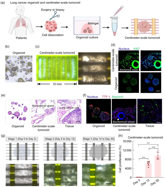免疫染色验证厘米级类器官完整保留源肿瘤的病理学形态与分子特征(图2e),甲状腺转录因子1(TTF-1)及NapsinA抗体共染进一步确认其肺腺癌来源属性(图2f)。上述结果表明,在需要大尺寸组织的肺癌模型构建中,厘米级类器官可作为传统类器官的重要补充体系,且突破常规尺寸限制实现了持续性生长(图2g)。在传统培养中,上皮源性肺癌类器官形成囊状结构,但因营养扩散限制导致核心区域细胞凋亡。而芯片培养体系呈现三阶段生长特征:早期形成球状克隆并逐步扩增;中期持续生长且无结构崩解;培养12天后类器官间建立紧密连接,形成与含血管网络的体内肿瘤高度相似的整合结构(图2g-h)。