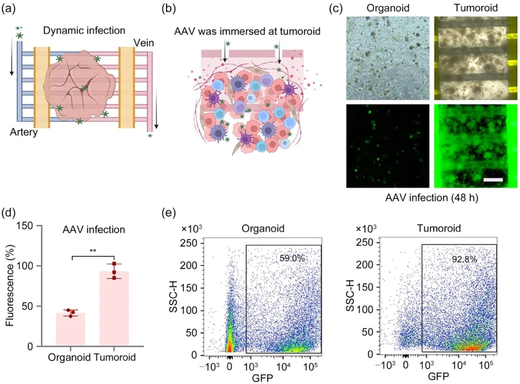 尽管类器官展现出高度仿生的生物学特性,其培养基质形成的细胞外物理屏障却阻碍了病毒颗粒的直接侵染,导致重组腺相关病毒载体(rAAV)在基因疗法中的应用受限。为模拟体内血管化肿瘤对病毒感染的敏感性,本研究通过微流控系统递送rAAV-GFP并评估感染效率(图6a-b)。通过向厘米级类器官缓慢注入新鲜病毒悬液实现深度渗透并与细胞充分作用,经48小时持续感染后,基于GFP阳性细胞比率评估转染效率。结果显示,厘米级类器官的GFP阳性细胞数量及荧光强度比率均显著高于传统类器官(图6c-d),表明血管化装置显著增强病毒侵染能力(图6e),且转染后类器官仍保持良好增殖活性。该厘米级类器官体系为开发基于rAAV的新型基因治疗策略提供了创新平台,有望加速基因疗法临床转化并提升治疗效益。
