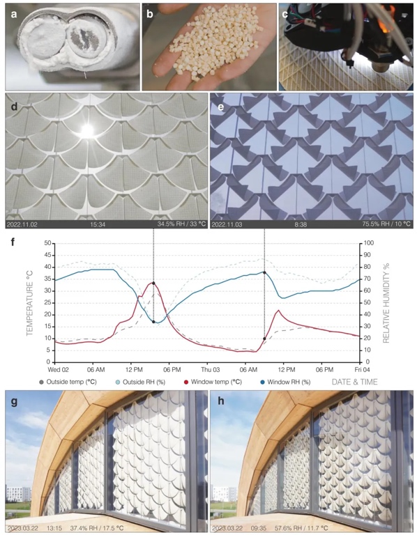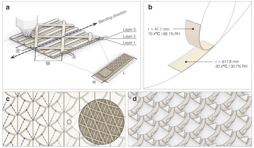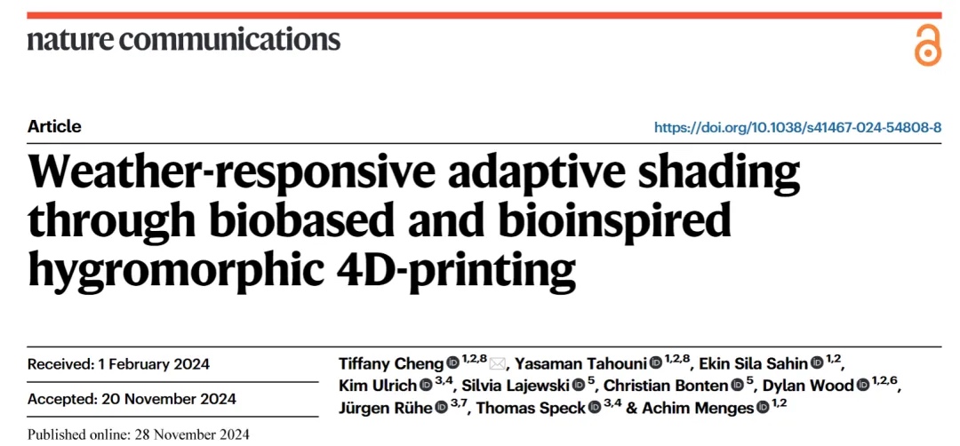 来自德国斯图加特大学的Achim Menges教授、弗赖堡大学的Thomas Speck教授和Jürgen Rühe教授团队合作,开发了基于生物基纤维素材料的仿生吸湿变形4D打印遮阳系统。该团队通过熔融长丝制造(FFF)技术打印由吸湿膨胀层(纤维素基生物复合材料)和限制层(耐紫外线ASA聚合物)组成的双层结构,模仿松果鳞片的吸湿变形机制,实现了对温湿度的自主响应。实验证明,该系统在实验室条件下可通过温湿度调控双层曲率(曲率范围0.011–0.0155 mm⁻¹),在真实气候环境中历经13个月测试,能根据季节和昼夜温湿度变化自动调整遮阳状态(夏季遮阳率达90%,冬季保持开放以吸收太阳能),且通过4台3D打印机并行生产,仅用17天完成424个模块的制造,展现出规模化应用潜力。相关工作以《Weather-responsive adaptive shading through biobased and bioinspired hygromorphic 4D-printing》为题发表在《Nature Communications》上。