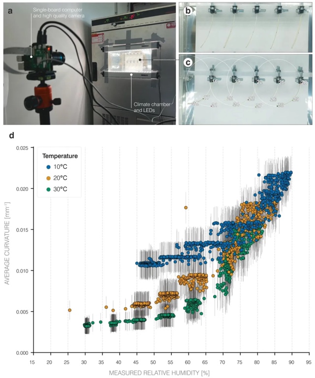 2. 温湿度对双层结构曲率的影响 利用气候 chamber 模拟不同温湿度组合(温度10℃、20℃、30℃,RH 15%-95%),结合高速摄像机和Python脚本追踪双层边缘标记点,研究温湿度对曲率的定量影响。结果显示,高温(30℃)下低RH环境曲率趋近于0,低温(10℃)下低RH仍有显著曲率,表明温度可调节吸湿变形的阈值响应,为适应温带气候设计提供依据。