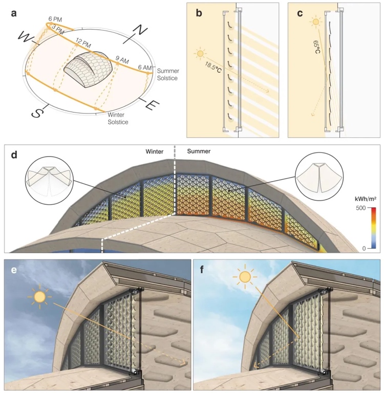 6. 遮阳系统的能效与环境效益分析 通过辐射模拟(EnergyPlus)和实测数据,对比传统遮阳方案,评估仿生遮阳系统的节能潜力。结果表明,夏季可减少41%太阳辐射得热,冬季增加27%太阳能吸收,年累计能耗降低18%,且全生命周期隐含碳较机电系统减少65%,展现显著的环境效益。