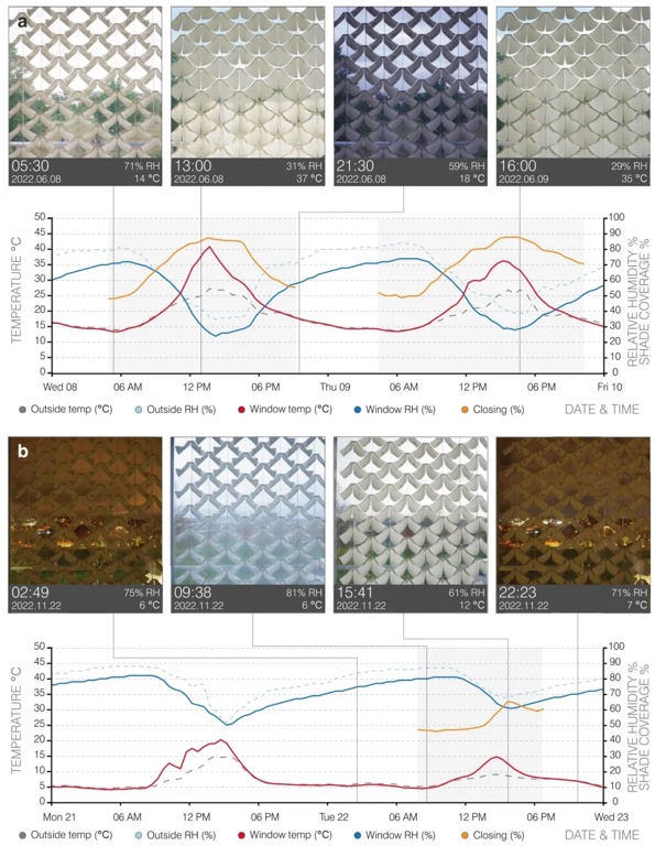 4. 真实气候环境下的遮阳性能评估 将4D打印遮阳模块安装于建筑外立面 mock-up,通过13个月的实时监测(温度、RH、遮阳率),研究其在自然气候中的响应能力。结果显示,夏季低RH(25%)时遮阳率达90%,冬季高RH(82%)时保持开放(遮阳率50%),且能响应昼夜RH波动,实现动态遮阳与太阳能收集的平衡。