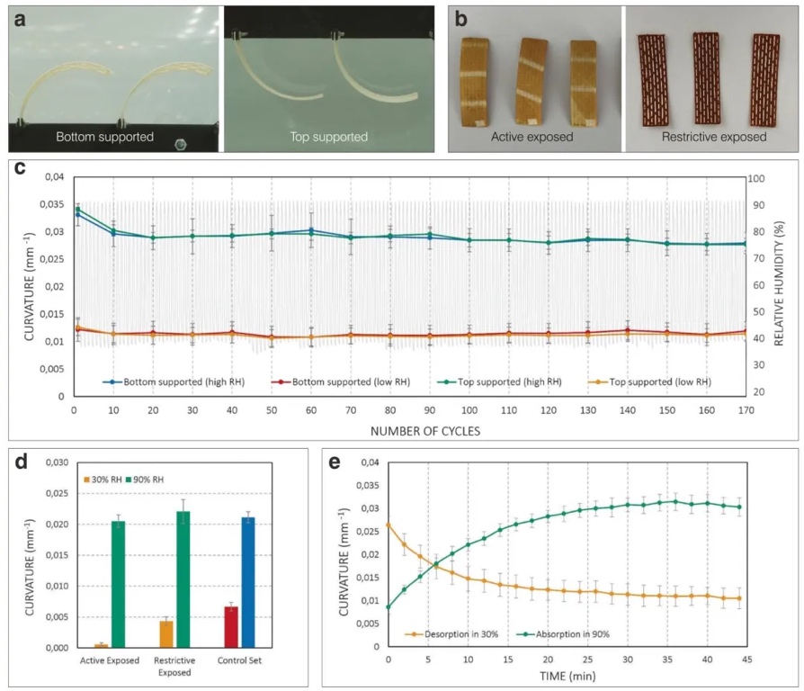 3. 循环驱动耐久性与紫外抗性验证 通过170次吸湿-脱湿循环测试和紫外(UV)老化实验,结合ImageJ软件分析曲率稳定性,研究双层结构的长期性能。结果表明,循环测试中高RH(90%)曲率仅在前10次略有下降,随后保持稳定;UV暴露对高RH曲率无显著影响,低RH(30%)下活性层暴露导致曲率下降0.006mm⁻¹,但仍满足遮阳需求。