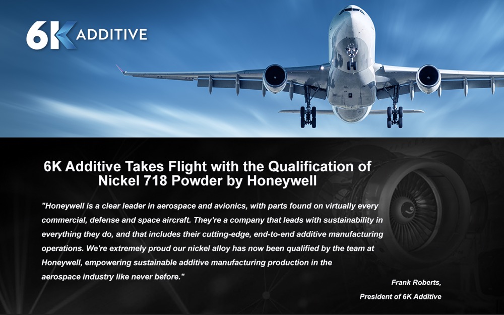 6K Additive首席营销官Bruce Bradshaw表示:“在霍尼韦尔这样全球领先的航空航天企业获得材料认证,是一个复杂且严格的过程。我们与霍尼韦尔的合作始于2023年,经过材料测试、现场审核及全面的供应链尽职调查,最终获得了认可。”