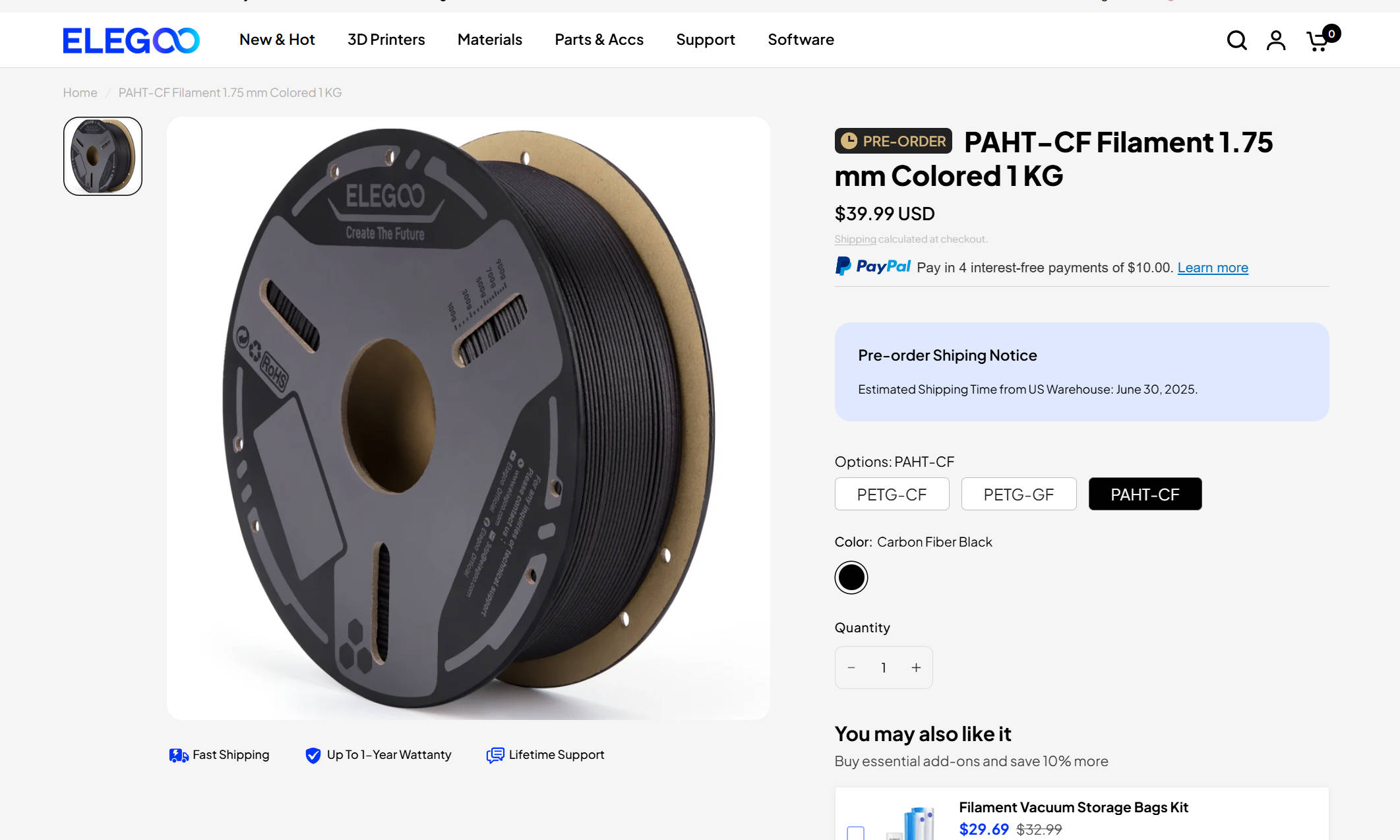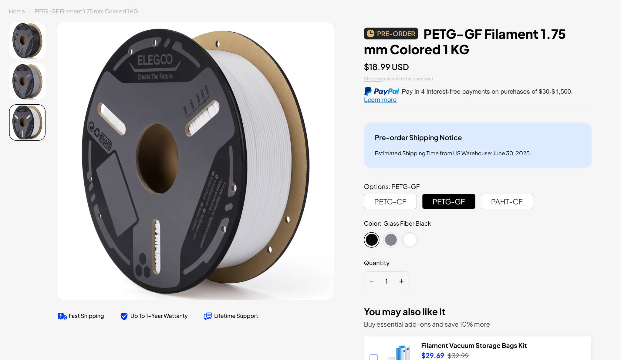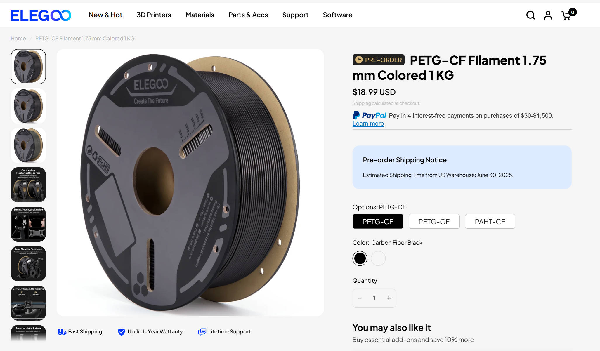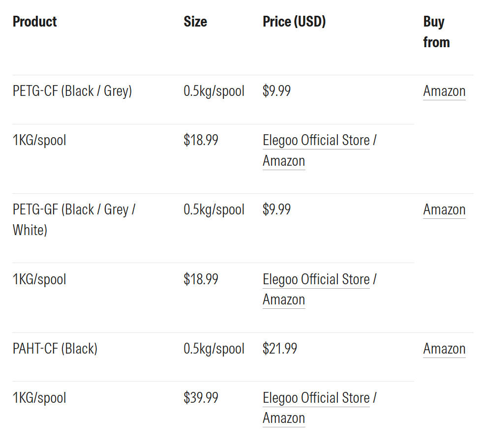 纤维增强线材系列现已在Elegoo美国、欧盟、英国、加拿大、澳大利亚的官方商店和亚马逊平台上线。具体美国地区价格如下: