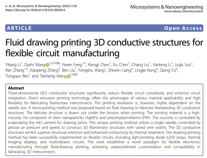 相关研究以题为“Fluid drawing printing 3Dconductive structures for flexible circuit manufacturing”的论文已发表在《微系统与纳米工程》杂志上。