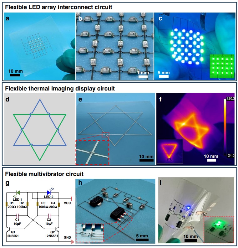 大连理工大学的这项技术不是将墨水推入喷嘴,而是像拉线一样将其拉出,利用气压、墨水粘度和热蒸发的相互作用。银纳米颗粒墨水经过精心配制,加热后变稠,在针头和基底之间形成稳定的“液体桥”。当针头抬起时,墨水会拉伸成细丝并立即凝固,从而使线宽细至 4 μm——比喷嘴本身还要细。调节速度和气压可以调节电线的粗细和长度。打印后热处理可提高导电性,将电阻率降低到接近本体银的水平(2.5 × 10⁻⁷ Ω·m)。印刷电线经过 200 次弯曲循环后仍保持完好并导电。电路演示包括具有垂直和水平寻址能力的 LED 阵列、云母片上的热成像单元和自振荡多谐振荡器电路——所有这些都是用单层打印制成的。这些独立连接取代了多层板,简化了架构和组装,同时保持了出色的电气和机械性能。
