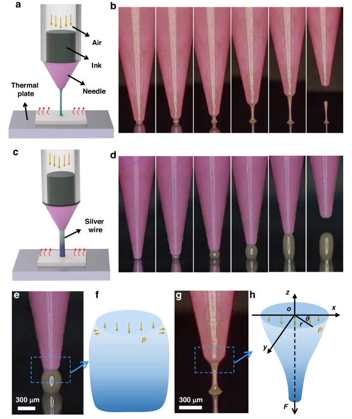 △流体拉伸打印技术与传统挤压打印技术。a 流体拉伸打印技术方法示意图。b拉伸打印阶段。c 挤压打印技术示意图。d挤压打印阶段。e挤压打印局部放大图。f挤压打印油墨受力分析。g拉伸打印局部放大图。h液桥受力分析