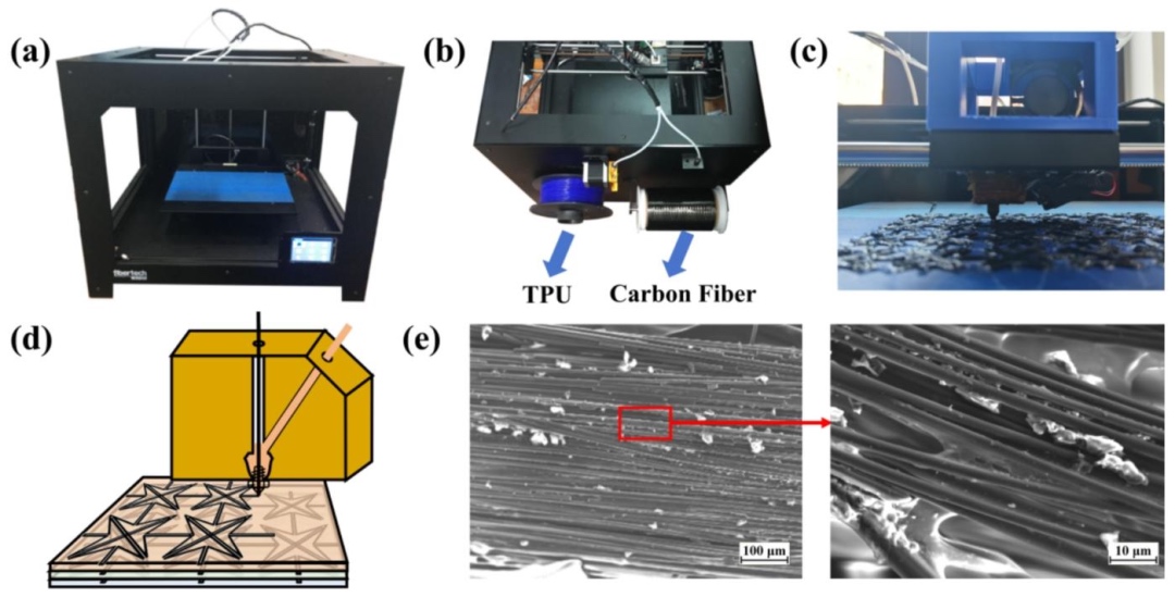 柔性多功能纤维传感器在电子皮肤、人机交互等领域应用潜力巨大,但存在成本高、生产效率低、集成困难等挑战,且传统传感器多依赖短碳材料或碳纳米管,制备工艺复杂,功能单一,多功能集成需复杂结构优化与材料组合。来自西安交通大学机械工程学院的韩宾副教授团队,利用连续碳纤维(CCF)和热塑性聚氨酯(TPU),结合熔融沉积建模(FDM)3D打印技术与星形超材料设计,开发出柔性多功能传感器,该传感器通过CCF的压阻特性实现对机械压力、温度等外部刺激的敏感检测,解决了传统传感器的痛点。相关工作以“3D printed continuous carbon fiber reinforced TPU metamaterials for flexible multifunctional sensors”为题发表在《Chemical Engineering Journal》上。