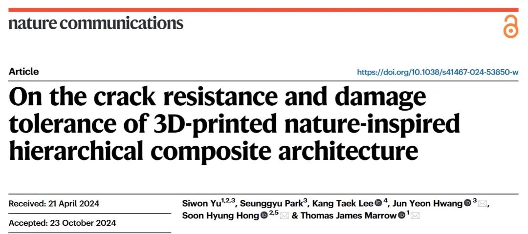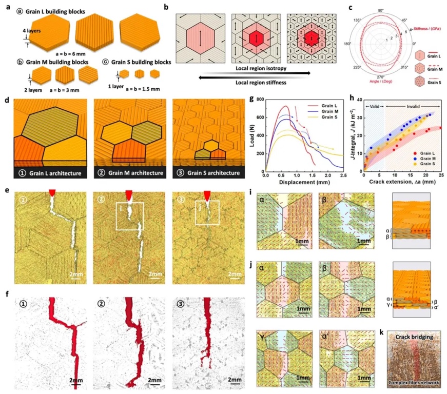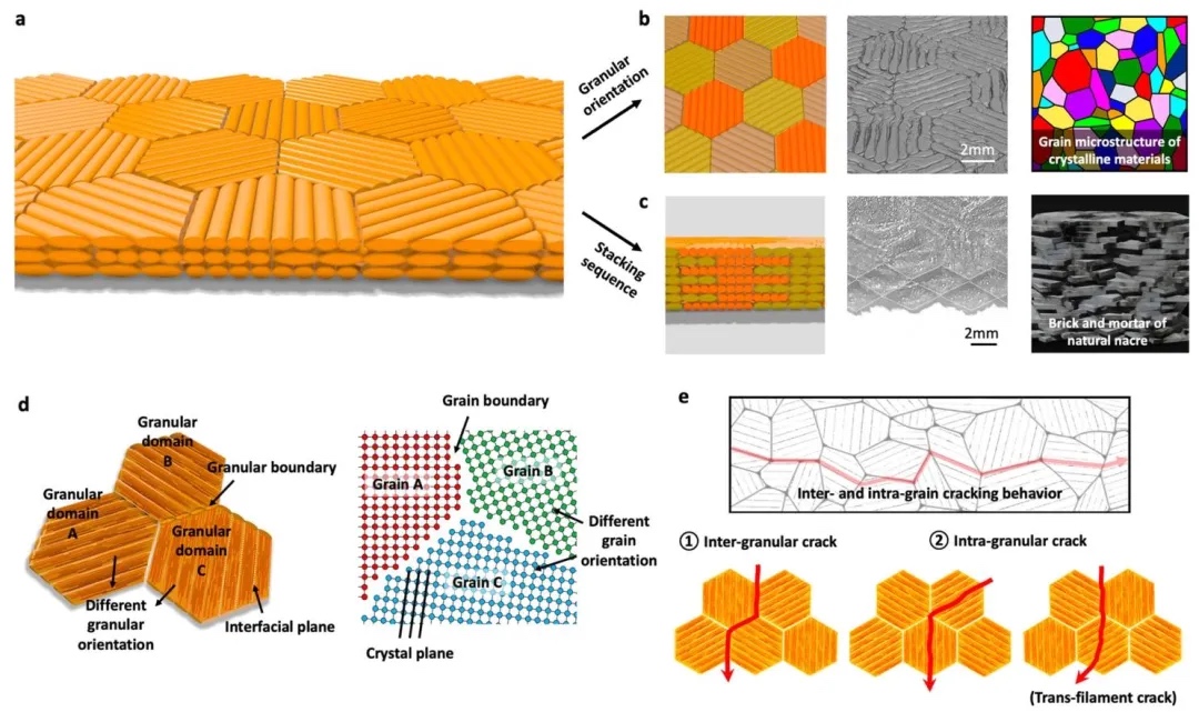 来自英国牛津大学的 Thomas James Marrow 教授、韩国科学技术研究院的 Jun Yeon Hwang 教授以及韩国科学技术院的 Soon Hyung Hong 教授团队合作,受自然启发,设计了一种 hierarchical 复合结构。该结构通过 3D 打印技术构建由具有特定拓扑纹理的颗粒状 building blocks 组成的分级组装体,利用工艺诱导的界面 void 提供优先裂纹路径,结合填充的定向纤维束增强局部各向异性刚度,调控局部/全局取向、堆叠序列、特征尺寸和梯度组装等因素对裂纹容限行为的影响。相关工作以“On the crack resistance and damage tolerance of 3D-printed nature-inspired hierarchical composite architecture”为题发表在《Nature Communications》上。