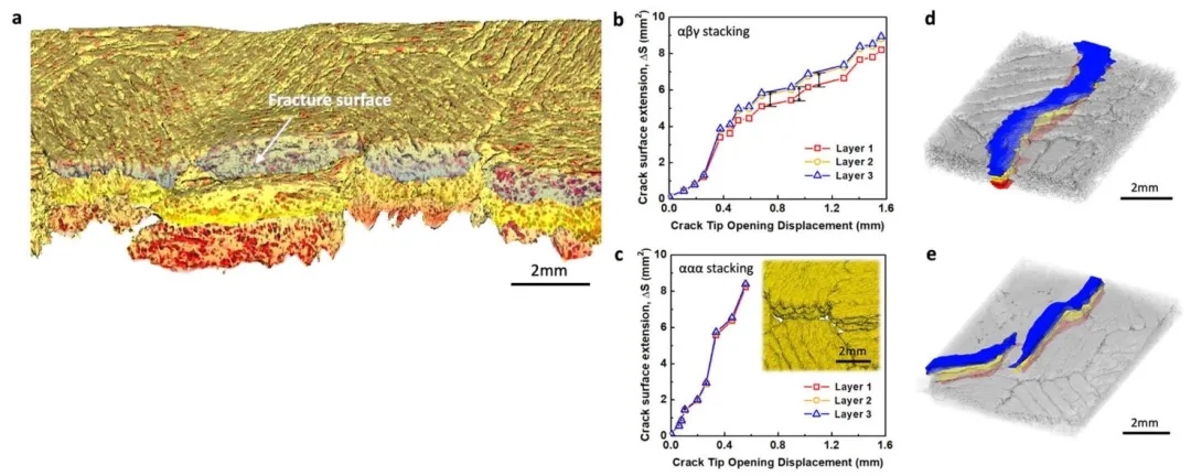 3. 堆叠序列对断裂韧性的改善,通过对比ααα单一堆叠与αβγ交替堆叠序列,利用R曲线测试和三维裂纹形态分析,研究了堆叠方式对裂纹抑制效果的影响。结果表明,αβγ交替堆叠可诱导裂纹沿“arrester方向”扩展,形成复杂分支裂纹,断裂能较ααα堆叠提升2.4倍,且表现出稳定的裂纹扩展行为。